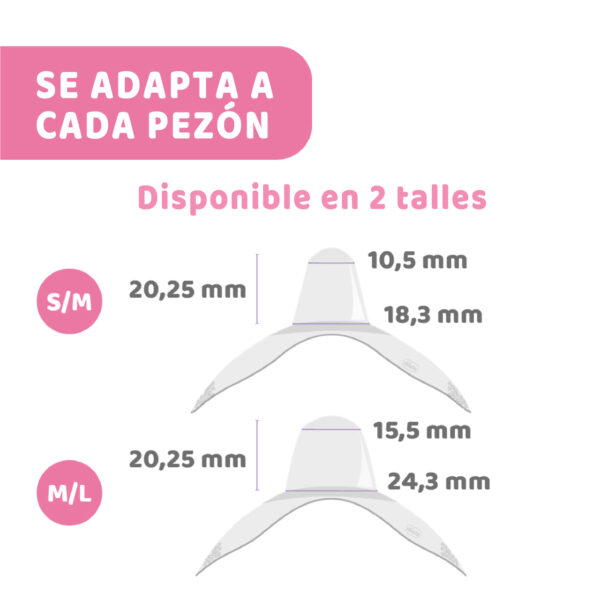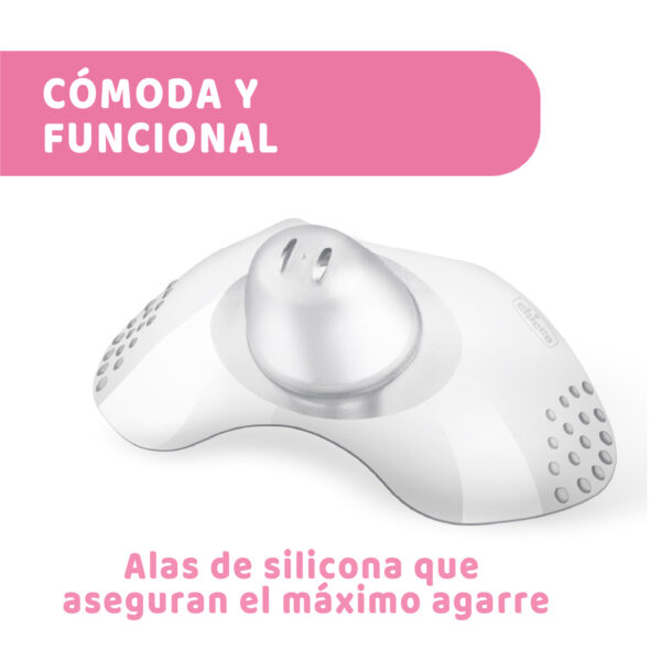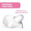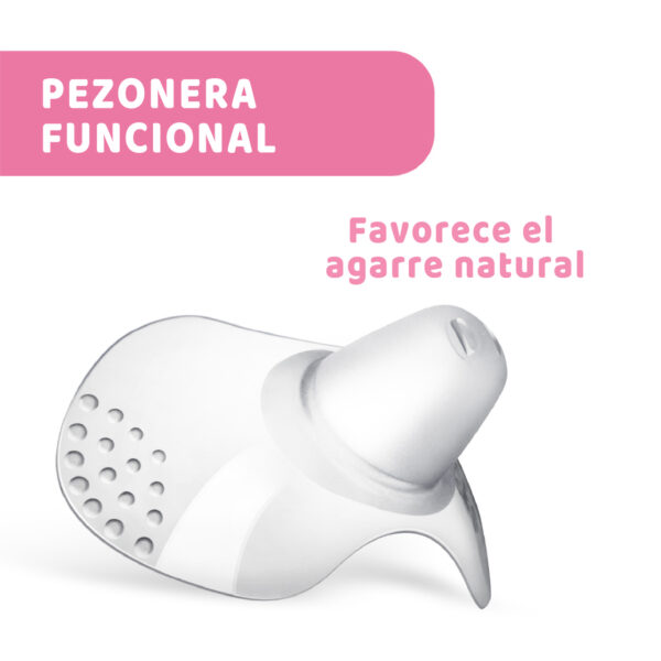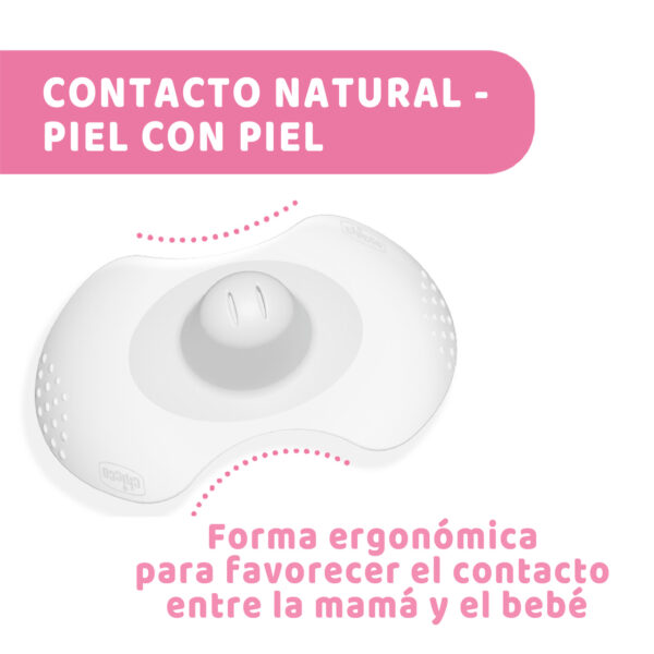 La especial forma ergonómica de la pezonera, extra corta arriba y abajo, está estudiada para garantizar el contacto de la nariz y de la barbilla del bebé con la piel del pecho, para una toma muy natural.